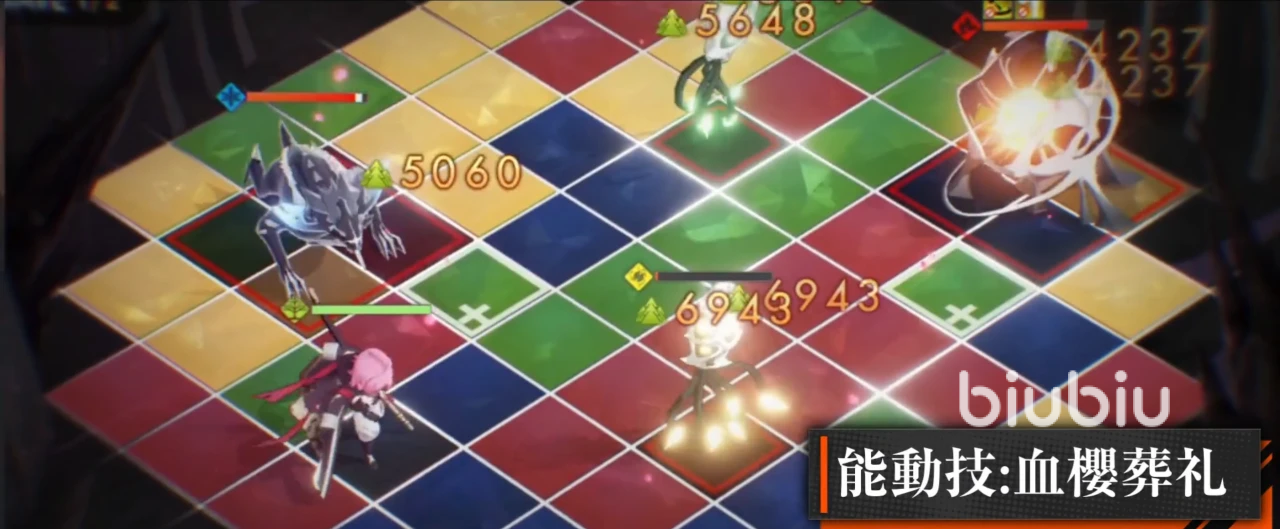 接下来说一下绯这个角色的技能吧,绯是一个主打爆破的光灵,属性是森,血樱葬礼是绯的主动技能,这个技能启动的时候能够将棋盘上的两个格子转化成属于绯自己属性的格子,并且对处于周围的对手造成损伤,但是这个技能有三个回合的冷却时间,如果绯在作战的时候能抢在对手前面先升到三级,那么是可以占很大的对占优势的。