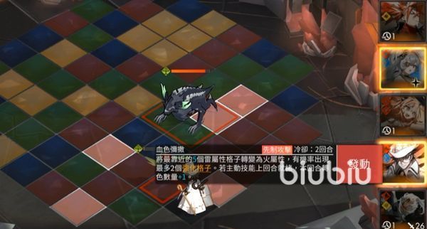主动技能的效果主要是在角色周边两圈以内选择一个可以行走的格子,然后把这个格子直接变成雷属性的,还能直接召唤出一个闪电疾蜂,在战斗的时候,这个蜜蜂最多可以同时存在四只,只要被敌人接触就会消失,消失后会增加一点补给数。