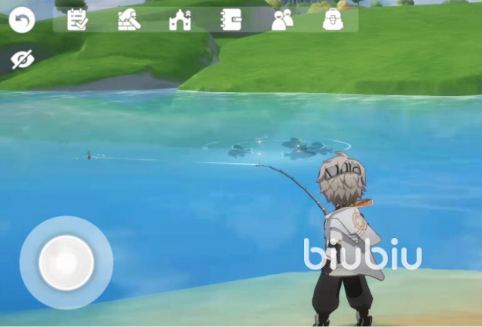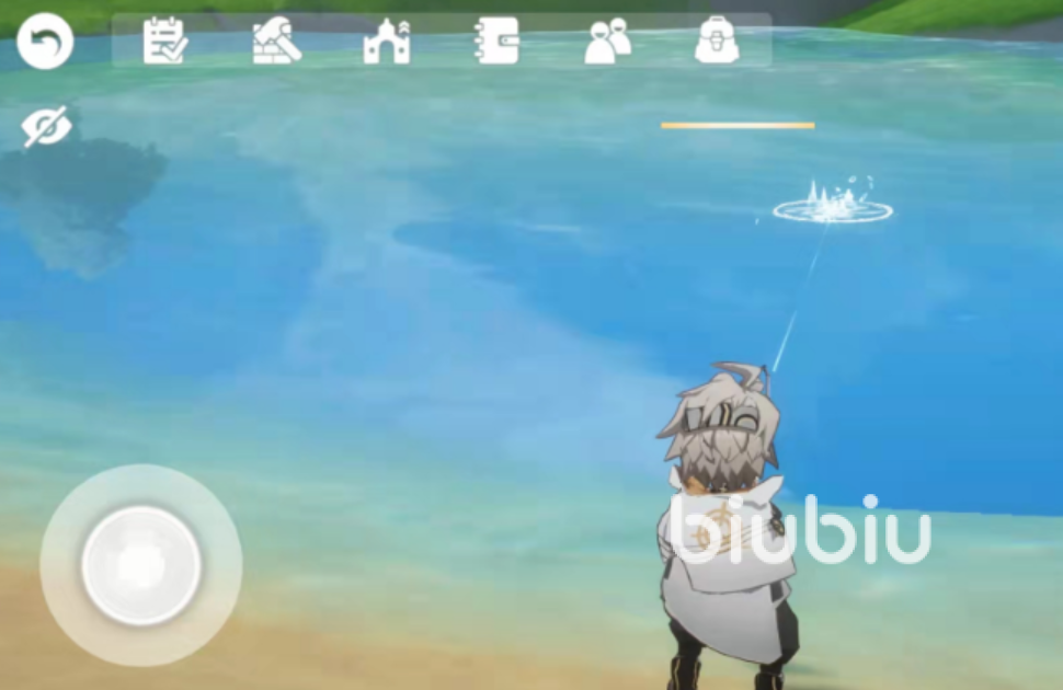 钓鱼区域内会经常出现一片地鱼群,这些鱼群会时常聚集到一起,这时候玩家就需要将鱼竿认出湖里进行钓鱼了,钓一个鱼的时间大致会维持在10秒左右,中间玩家需要控制力度,力度大概保持中等就好,有一部大型鱼类的进度条会来回晃动,玩家就需要频繁地进行移动才能钓到。