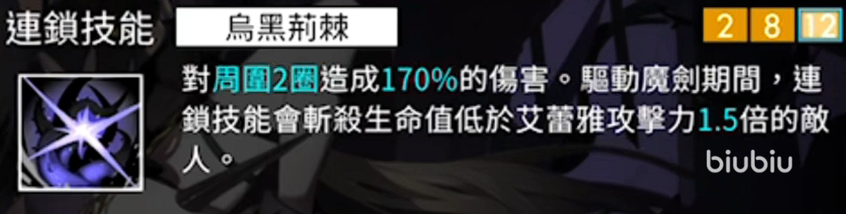 技能方面,主动技能发动魔剑。该回合类自身攻击力再获得20%的提升,但是回合结束后会有所削削弱。觉醒三之后,还会额外获得持续一回合的斩杀,血量低于该角色攻击力150%的敌人。简直可以称为杂鱼粉碎机,所有血量低于攻击力加持下的人都将会被秒杀。