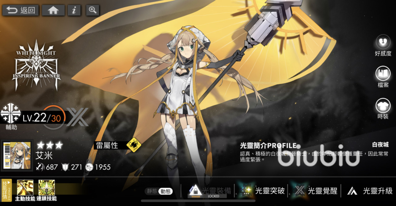 艾米,雷属性三星辅助光灵。她的主动技能其实并不带有回复效果,在使用主动技能后,玩家们可以选择任意一个位置放置旗帜,艾米自身距离旗帜的距离越近,防御越高。连锁技能则是她唯一的回复技能,为队伍回复等同于艾米自身160%攻击力的生命值。