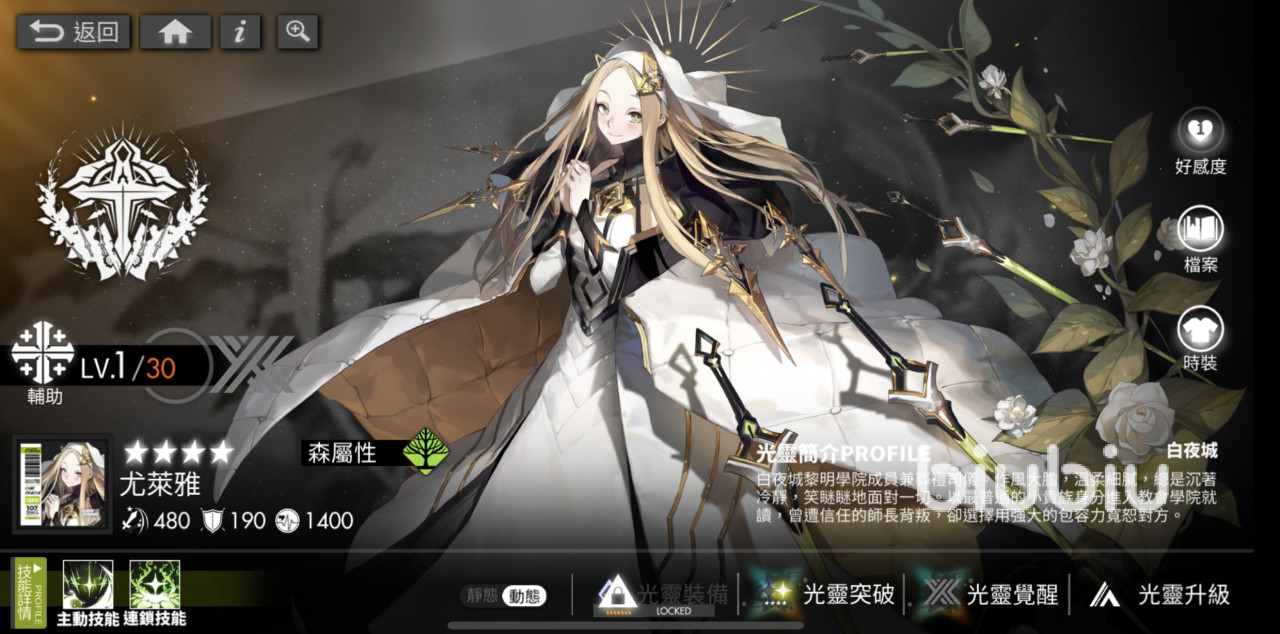 尤莱雅作为白夜城黎明学院的成员兼葬礼司仪,定位为辅助,是一名获取难度非常低的森系四星辅助角色。尤莱雅的技能组效果都与回复相关,主动技能除了为队伍中成员提供血量回复之外,还会额外将离自身最近的森属性各自转变为强化格子,提供普通格子两倍的连线伤害倍率加成。在新手开荒的过程中十分百搭,前期全森队必备的光灵之一。