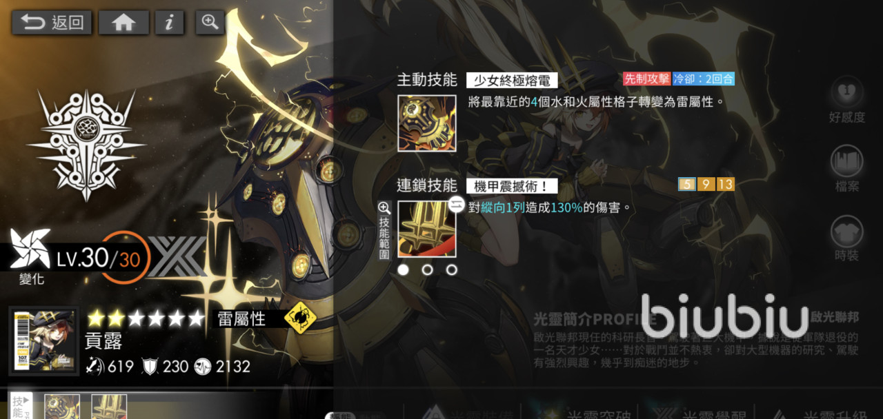 贡露的主动技能【少女终极熔电】,作为先制攻击出现,在开局进入战斗后可以直接释放。技能冷却时间为两回合,在使用技能后,将最靠近自身位置的四个水和火属性格子转变为雷属性。
