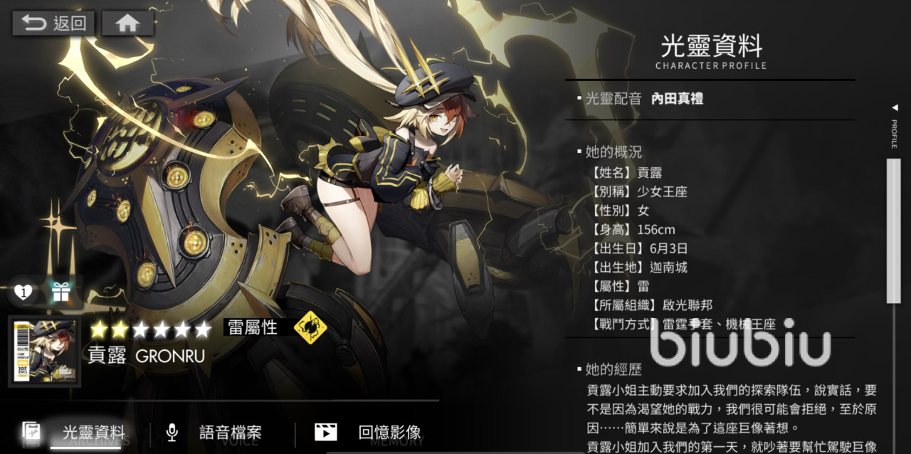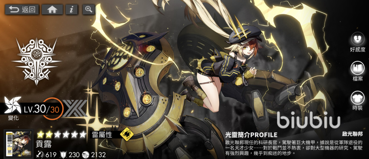 贡露的初始星级为六星,是启光联邦现任的科研长官,热爱有关于科学研究相关的一切事物,驾驶着巨大的机甲。也许是因为贡露定位是转色光灵而不是全职输出,所以贡露的基础攻击力对比同属性的米迦勒来说偏低,但这并不影响贡露的登场率。由于贡露自身强大的转色能力,其在白夜极光手游的任何一个地图中都有着非常高的上场机会。