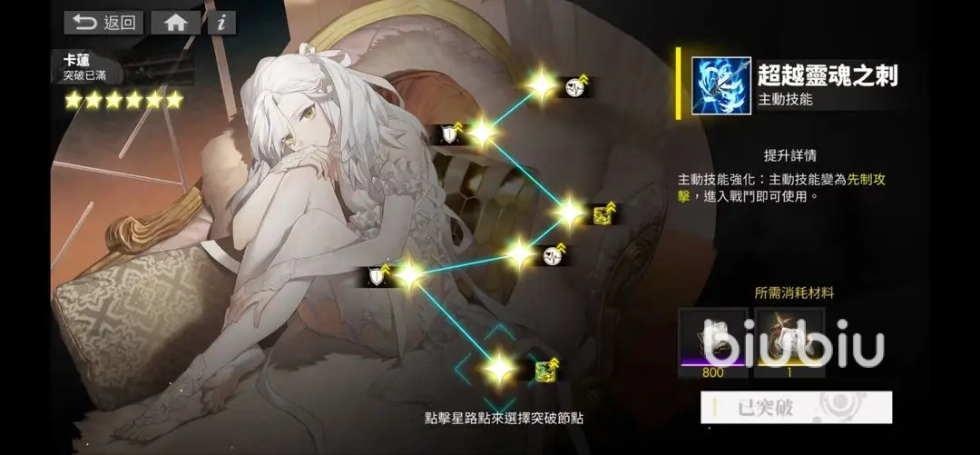 超越灵魂之刺是她的主动技能,这个技能启动之后卡莲可以向指定位置发起瞬移,对对手造成损伤,同时将范围内的格子转化为自己属性为自己增强,冰枪风暴是她的连锁技,连锁是对应2、8和13连锁,造成的伤害也是逐级递增的,比较值得一提的是她的装备技能月茧,这个技能可以理解为自身的增益类技能,将自身的攻击力更叠buff一样每移动一格水属性就叠加一次,这个技能可以让卡莲的所有技能都更加强大,从而立于不败之地。