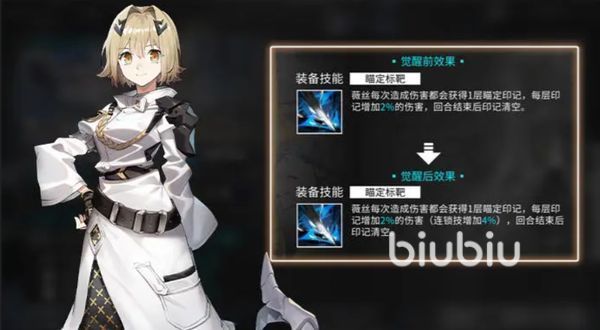 薇丝觉醒达到三阶段的时候,他的装备技能还会额外对敌人增加一层标记,该标记能对敌人造成连锁技能的伤害效果,本次攻击还会提高4%的伤害效果,但是4%的伤害效果是需要装备达到十级之后才能达到的程度,所以大家需要将装备和光灵觉醒灵活运用,才能发挥角色最大实力啦。