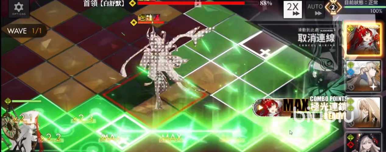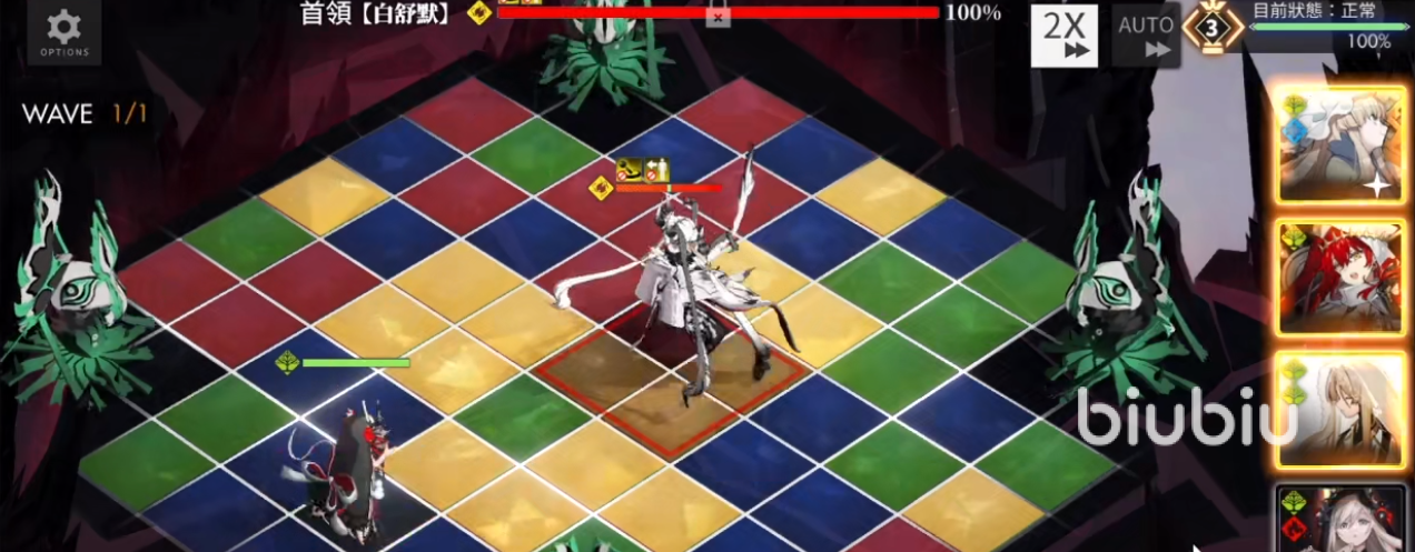 如果你们在首个回合所走的位置不是很好,距离同色系的格子比较远,那么在下一回合就会有很大的概率被角落的触手封印住多数人物。这个时候的最佳方案是等里面的头目使用完技能将角色移动到墙边,这个时候可以使用其中一名角色囤积了的转色技能,然后让距离自己最近的五个火系格子全变成森系的,并将之前转换过来的同色全都连起来。这时候就可以继续走15格,并直接步入极光时间,以此来解锁其他角色,并展开新的一轮战斗。