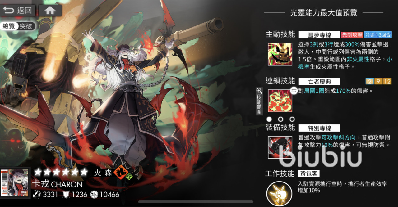 想要配置一个强力的队伍,必不可少的就是输出角色。而在所有的火系输出角色中,卡戎的地位是目前版本中不可替代的。卡戎的攻击范围是斜角,这也就代表了卡戎能从非常安全的角度尽量攻击到更多的敌人。作为主要输出角色,卡戎还额外带有洗格子的能力。技能组中自带的击退效果除了造成伤害之外,还能够调整敌方的位置,方便灵活的移动和输出。