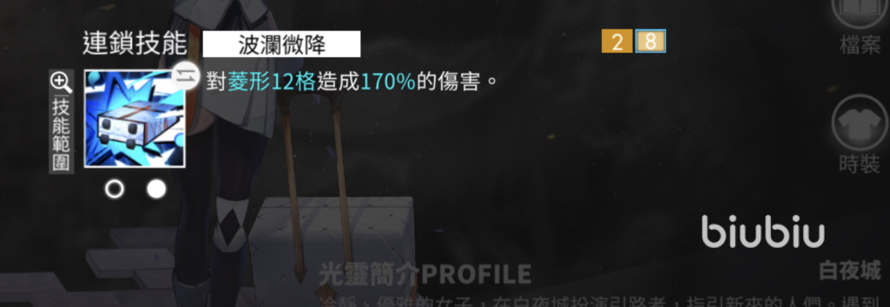 无论是哪一种类型的光灵,释放连锁技能都是他们对敌人造成伤害的重要手段。前文中已经提到,在同色格子行走一段距离可以触发光灵们的连锁技能,但这段距离的长短直接决定了连锁技能的效果及强度。仍然以MISS白兰为例子,她的连锁技能只有连锁二和连锁八两种情况,在连锁二时技能伤害范围是周身一圈,倍率为155%,达到连锁八时,伤害范围提升为菱形十二格,伤害倍率也上涨为170%。