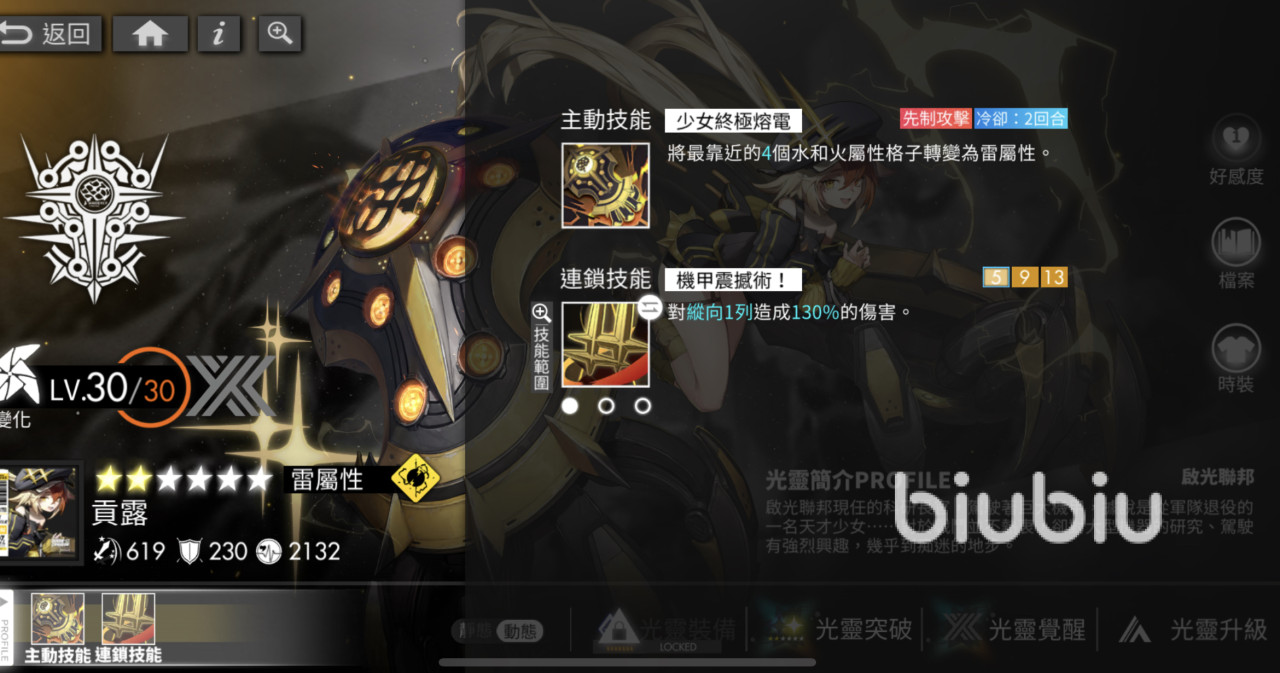 贡露作为一名变化类光灵,在队伍中的主要任务与MISS白兰一样,实际上是以辅助转色为主。贡露的主动技能【少女终极熔电】,能够将最靠近自身的四个水与火属性格子转变为雷属性,有着属性的限制,在玩家们周围没有这两种属性格子时,建议先移动一小段距离再使用该技能。