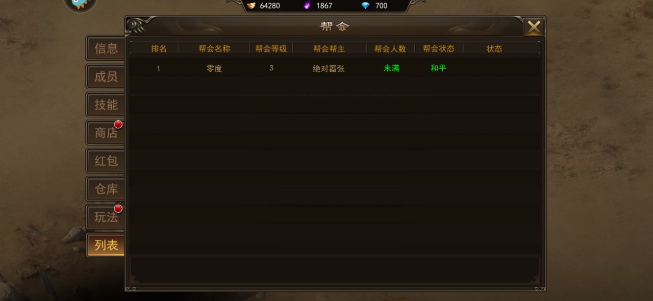 4、点击帮会功能栏,系统就会将目前的帮会界面展示出来,我们可以看到帮会的名字、排名、人数等相关状态信息。
