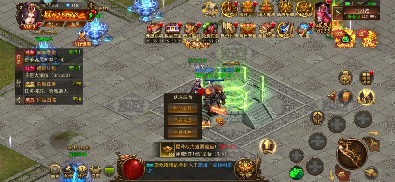 如果说等级和宠物是提升武力值的基础,那么装备就是提升武力值的“灵丹妙药”,越高阶装备的装备带来的武力值就越多,想要获得这些装备的玩家可以多打boss。另外我们可以铸造一些神器类装备提高自己的战斗力。