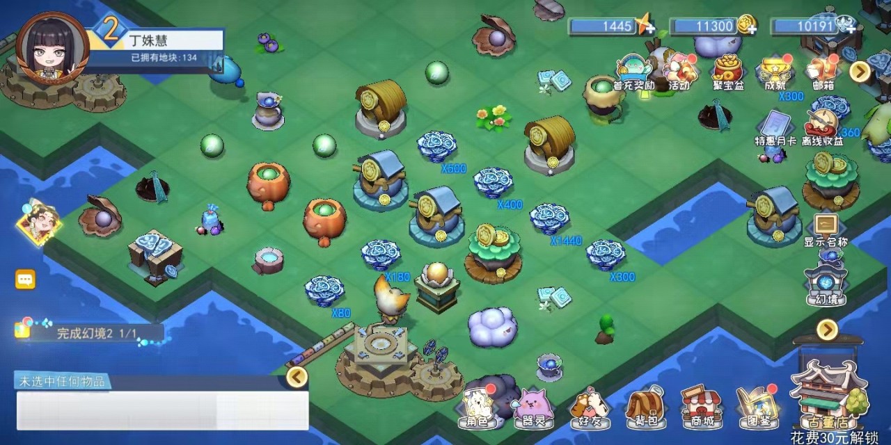 最后一种玩法就是方天匣,这个玩法可以说也是游戏内最主要的玩法之一了,玩家可在方天匣内修复古董,也可通过合成不同的材料去采集露珠。当露珠达到标准时,可解锁被封印的土地,土地数量越多,代表玩家的实力就会越强势,另外在方天匣内也会有很多器灵。