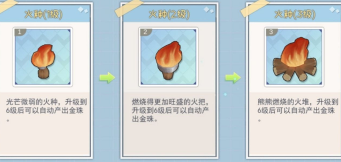 树木每过一段时间点击可以采集枯枝,将枯枝在地图上放置一段时间可以获得火种,火种能自动产出金珠。