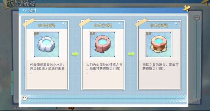 水井是主要获得金币和珠贝的途径之一,升级到4级的水井每过几分钟就会产生一个回忆之泉。