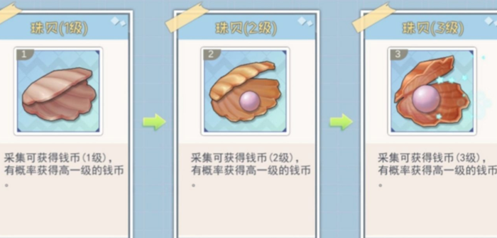 珠贝的主要获得途径是通过水井,采集珠贝可以获得钱币,随着珠贝的不断升级,可获得更高等级的钱币。