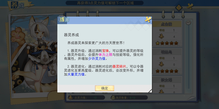 玩家可以通过消耗宝珠去升级器灵,还可以通过消耗碎片去进化器灵,这都可以增加器灵的灵力值。