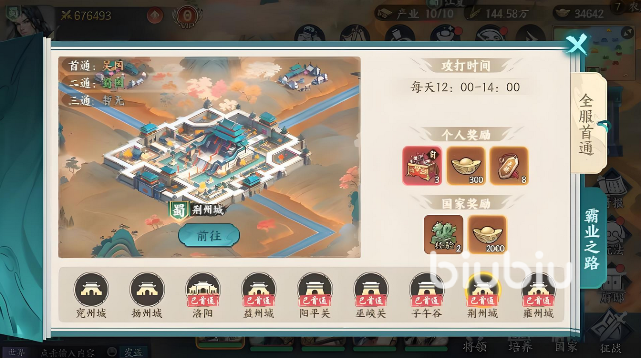 开服之后的第1天,因为存在系统时间方面的限制,所以此时是没有办法去开荒打关口城池获得奖励的。也就是开服的第1天正常完成任务升级和搭配武将阵容就可以了。大家也可以通过游戏界面进入到一统天下玩法,这里可以看到各个关口、州城以及皇城的开放时间,这样能提前进行规划。也可以通过霸业之路,看到所占领城池的王国奖励和成员奖励,以及能够解锁的官职,这样能够根据城市开放的时间和自己需要的奖励,提前筹备到底攻打哪一座城池,以快速解锁相应的奖励。