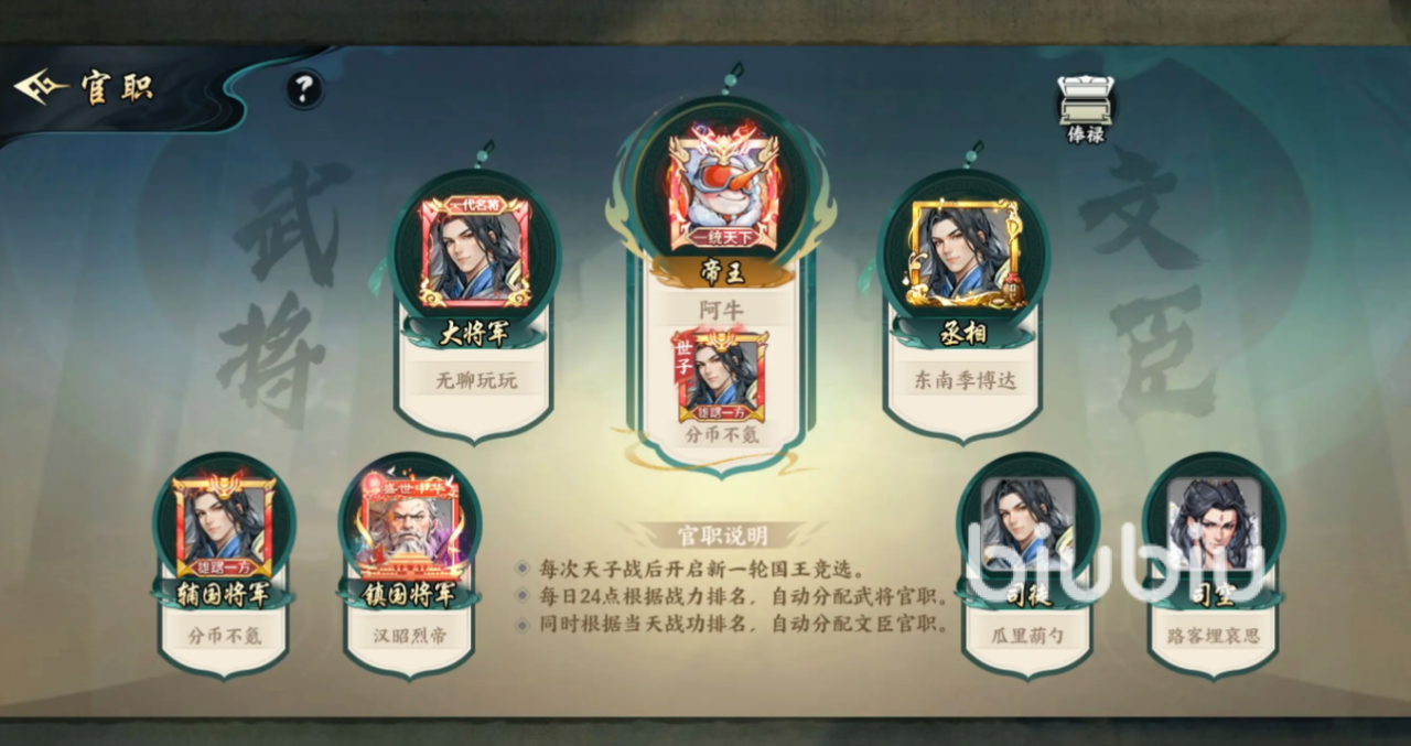 根据小编了解到的信息,比较不错的是他的武将官职是能根据玩家的战斗力排名每日结算的,高战力者能担任大将军、辅国将军等职,而文臣官职方面则是根据当日累计战功分配,如丞相、司空、司徒等都是,主要是侧重战略运营方面的能力,每日会在24点系统自动评定,竞争方面还是很激烈的,所以玩家想要有个较高的官职,那么自己得保持活跃。