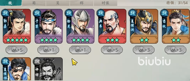 这里面第一个要看的是魏国势力的阵容,该势力下阵容有一个明显的特征,那就是以寒冰属性为核心拥有强控制的手段,角色几乎都拥有施加这个控制的能力,所以在阵容的组建上就需要去发挥寒冰属性,需要在里面去找拥有这控制能力的角色进行阵容的组建,就比如许褚、夏侯渊、郭嘉这种角色,使用它们去搭配出一套拥有强大控制能力的阵容。