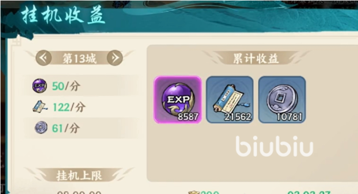 如果主线推进到一定程度,感觉受到了阻碍,挂机收益就是另一个重点渠道,一般挂机收益是能累积8小时的,这是没开月卡权限的情况下,也是开荒期之后主要的经验获取来源,而且每天还能领取一定次数的快速收益,无需等待几小时就能获得资源,免费次数后也能通过元宝购买次数。