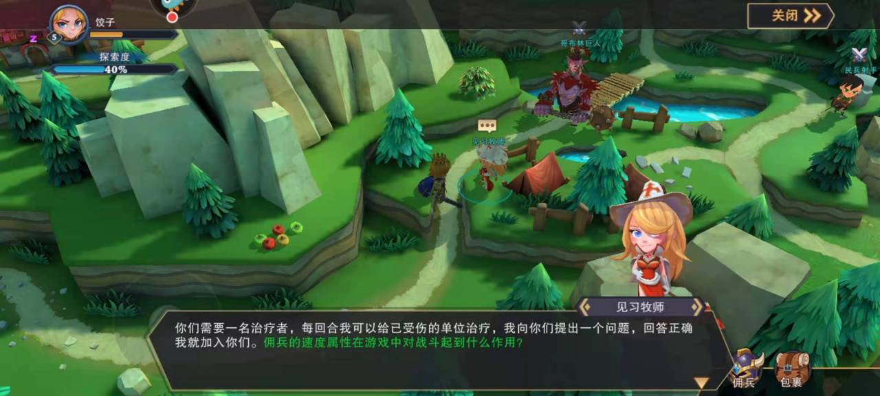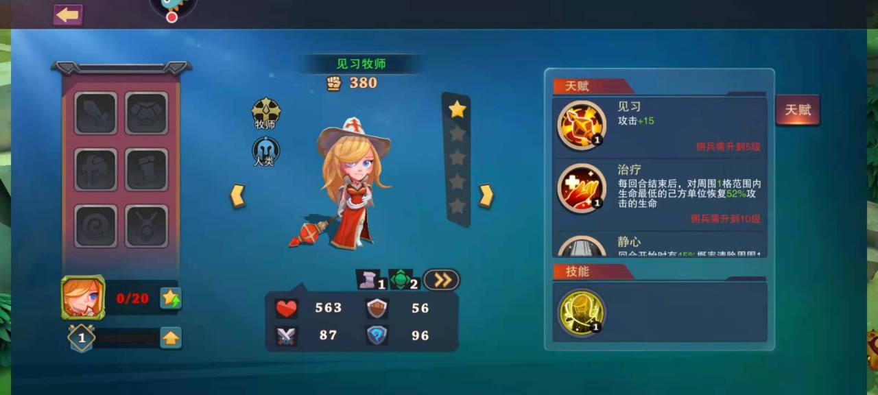 其次,在游戏出征过程中,玩家就会需要一名疗伤者,每回合出征时可以给受伤的单位疗伤。因此,拥有疗伤功能的佣兵就是一个很好的必不可少的选择,玩家可以通过新手试炼获得见习牧师,见习牧师自带有疗伤的功效,在战斗过程中会给己方的佣兵恢复血量。