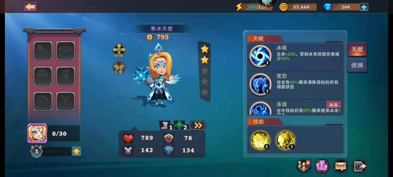 寒冰天使的冻结天赋击中目标后又20%的概率使其冰冻一回合,这样就为己方提供机会,进攻对方,使其收到伤害,技能女神之力更除了可以在己方恢复生命力之后,攻击力会增加14%,可以叠加五次。
