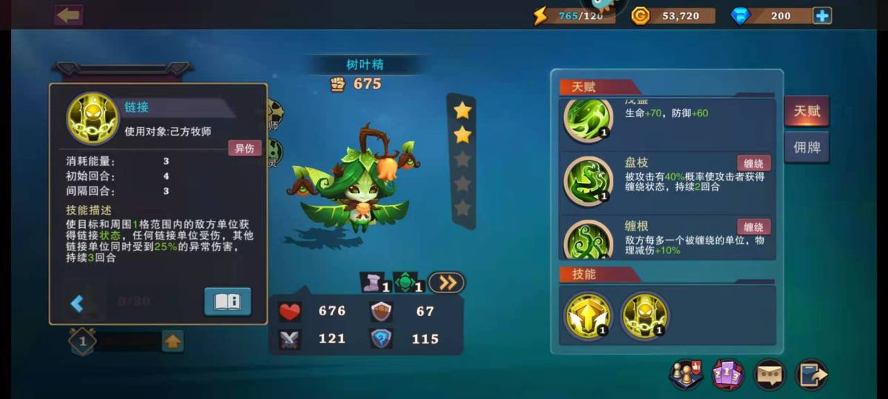 树叶精灵的盘枝天赋,在树叶精灵的被攻击后,又40%的概率使攻击者获得被缠绕的状态,持续两个回合,使其无法对己方进行攻击,缠绕时还可以使对方物理减伤增加10%。它的链接技能,使目标获得链接状态后,任何的链接单位受伤,其他的链接单位同时收到25%的伤害,这对己方来说就是很好的进攻时机。