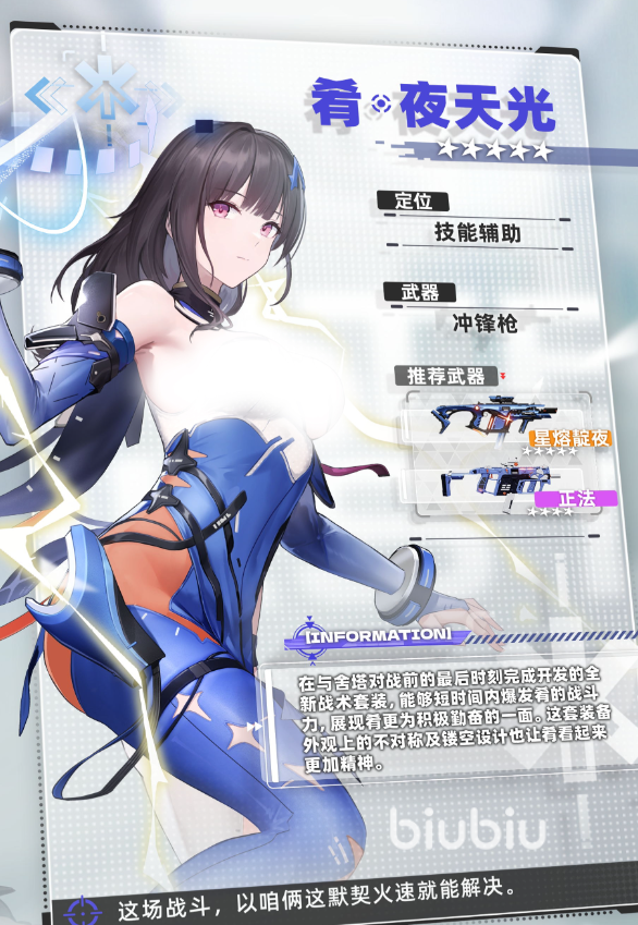 肴夜天光是一位冲锋枪电击类型辅助角色,她的常规技会发射出“急躁电工”冲向附近的敌人并爆炸,形成范围伤害后还能回复自身的爆发能量,如果处于“暮闪领域”范围内使用这个招式,就会一次性发射出多个“急躁电工”连续朝目标方向射击,每一个命中都会形成范围伤害并击飞目标,建议大家实际使用时善于利用这个加强效果,击飞目标打出控制效果。