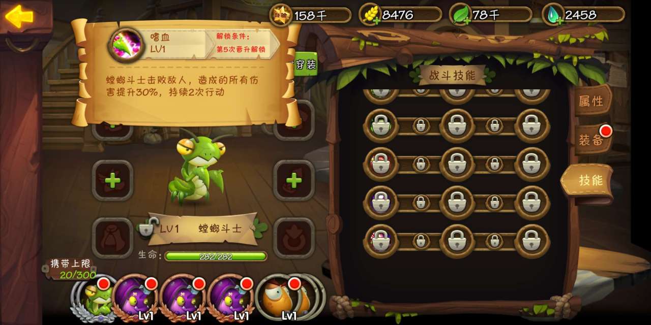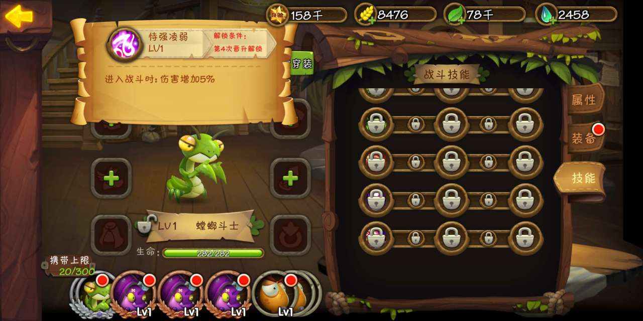 进化第四次获得的同样是属性上的增益,螳螂斗士能够增伤5%,配合第三次进化获得的攻击力,螳螂斗士能成为一个爆发非常强的角色。