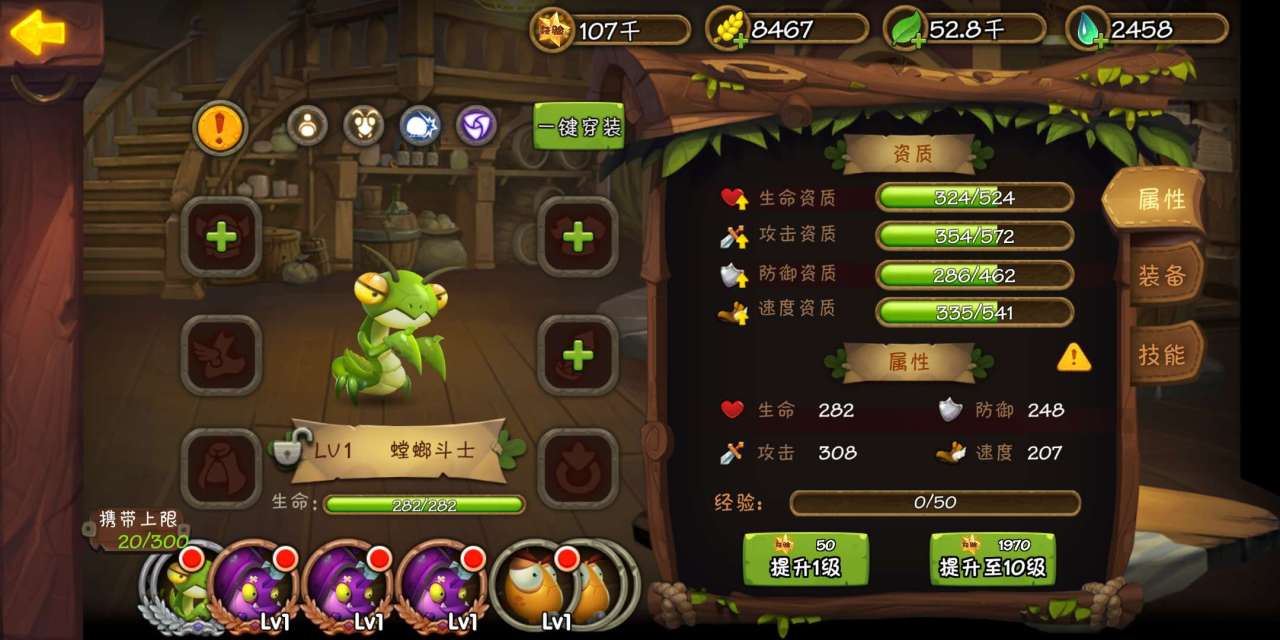 在玩家完成新手章节后会免费获得一只螳螂斗士,螳螂斗士的初始资质是直接过数据条一半的,一拿到就可以直接用,不需要怎么培养就有很高的伤害。螳螂斗士除了属性数值很不错以外,它每次进化获得的技能也是非常好的。