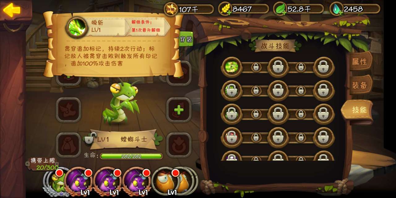 螳螂斗士每次进化都会加一个技能。进化第一次会获得被动瞬斩,能够给命中的敌方增加一个两回合的标记,被标记的敌人再次被螳螂斗士攻击的话,会额外产生100%伤害。