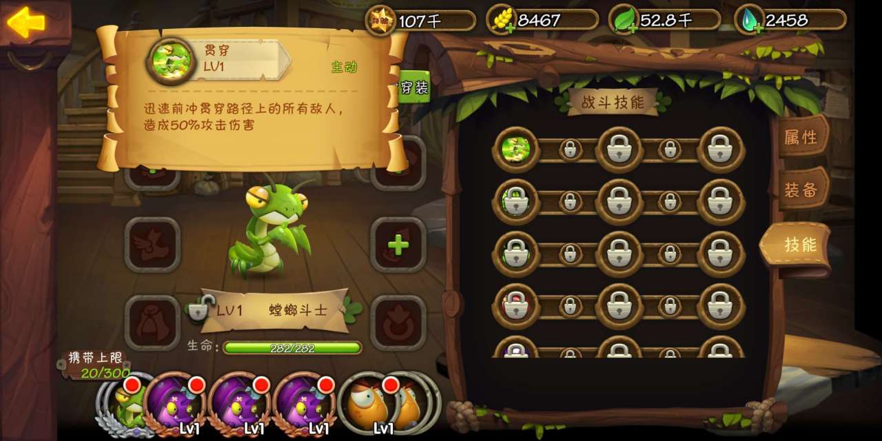 螳螂斗士1级主动技能是贯穿,能够造成50%的攻击伤害。螳螂斗士强的地方在于,它既是近战攻击的一把好手,还能够打出范围伤害。螳螂斗士是支线攻击方式,但是它可以顺带给被撞击目标周围的敌方造成伤害。螳螂斗士在撞击敌方之后还能够弹回到己方这边,只要蓄力的强度够大就能够产生很大的撞击弹力。
