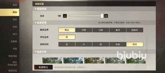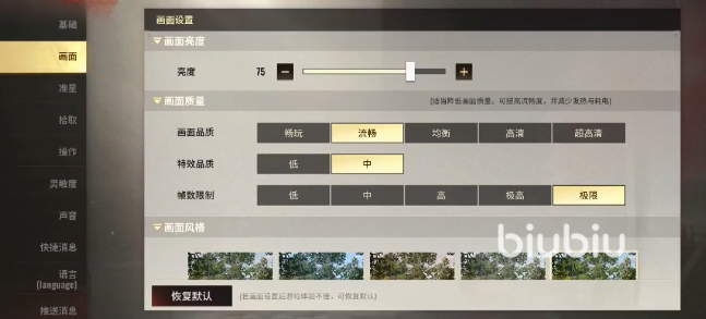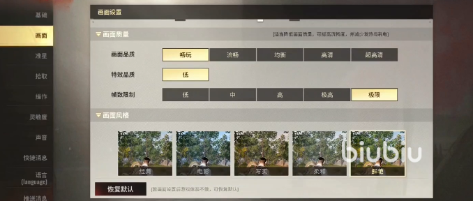 第二个方面就是画面质量,由三个部分组成一个是材质,最高可以达到超高清,让细节非常丰富,当然也十分耗电和容易过热,下面一栏为特效,基本上是子弹打出去的火光以及部分环境光线,在几个低画质下这个选项比较少,毕竟也算是跟着画面材质走的。第三栏为帧数,帧数越高也就越流畅,开到极限也不会有什么限制,不过这个基本上电竞高帧率手机才有效果,一般手机还是为最高90帧率,所以得看看自己的配置。