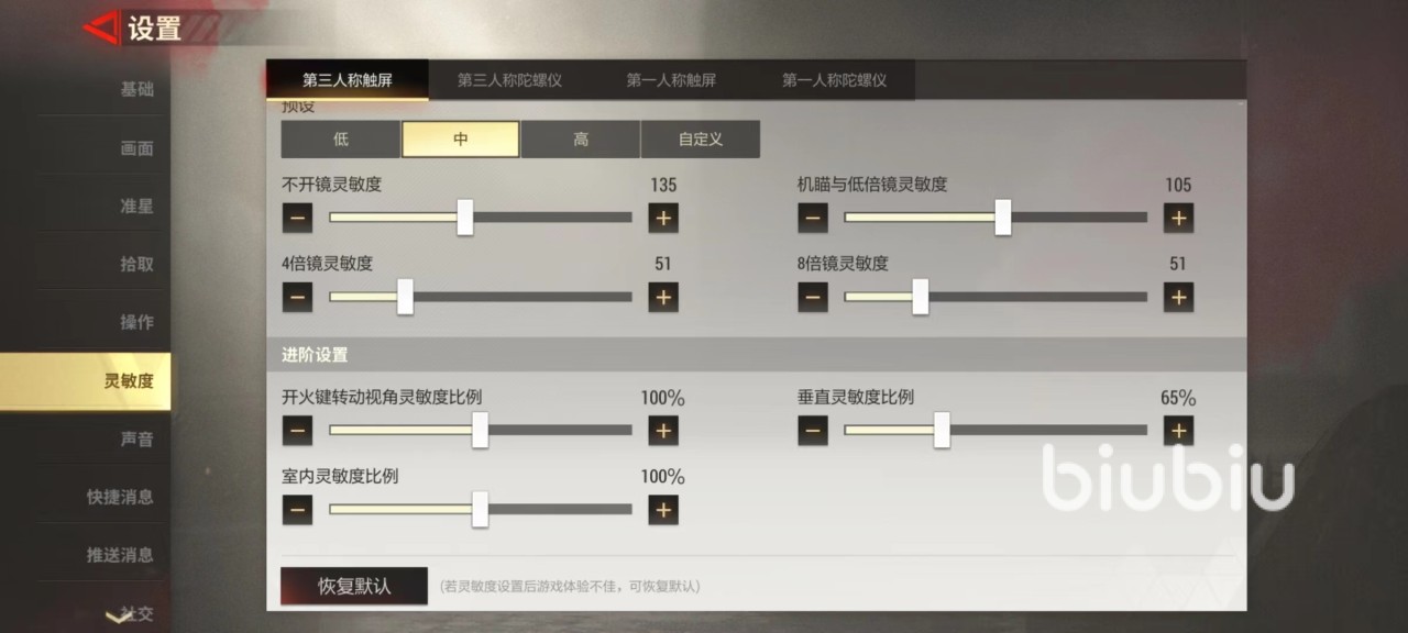 配件仅仅能提供硬件上的支持,接下来在实际设计中还需要根据自身操作习惯在灵敏度上进行一些设定。选择好灵敏度系统之后找到8倍镜灵敏度,在数值上进行加减,这就要根据自身习惯来判定,如果喜欢较低延迟,建议设置在30左右,如果喜欢较高一些在50左右,如果灵敏度设置的太高就很难选中要射击的目标,太低难以跟上对方移动对扫射不利。