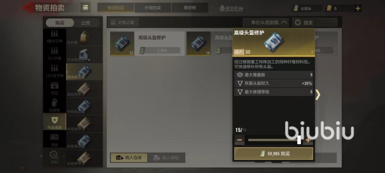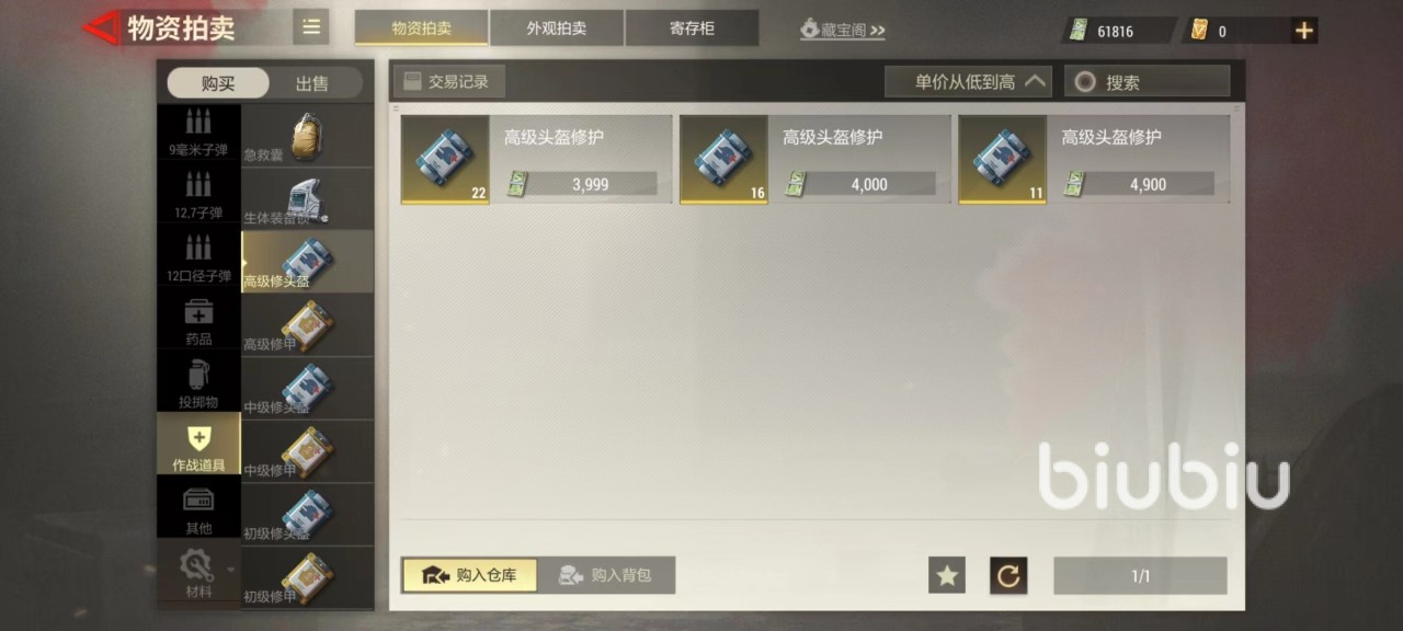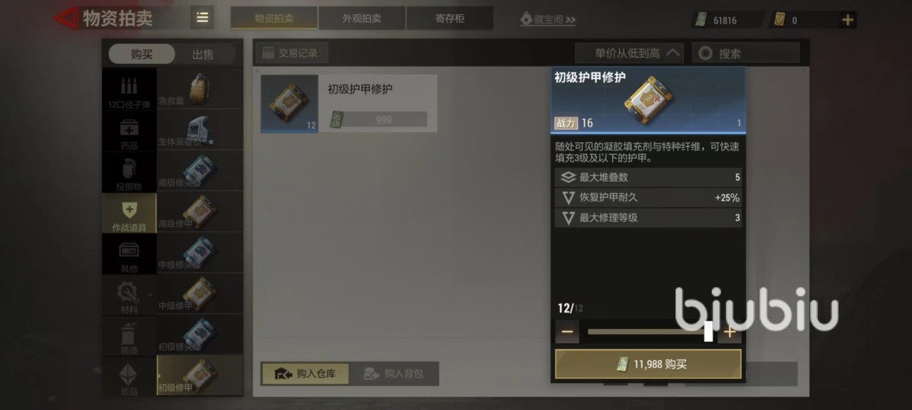 在作战道具中主要包括有急救囊,修头盔和修甲这四大类型,其中修头盔和修甲又分为高级,中级和初级三种不同类别。无论是哪一类型修护,所起到作用都是在战斗中快速将护甲或头盔等防具耐久填充起来,不同的是所能作用的防具等级不一样。例如初级护甲修护,只能恢复三级以下护甲25%耐久,而到了高级护甲修复则是可以将所有护甲全部快速填充,当然耐久恢复依然是25%,这点不会改变,头盔也是如此。