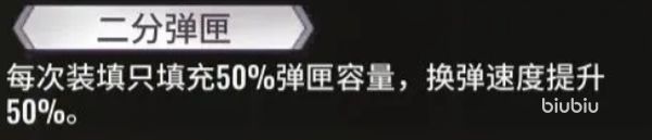 二分弹匣: 不同于上一个,它是将弹夹容量变成了换弹速度,每次装弹夹只放50%的容量,但是换弹速度则会提高50%。