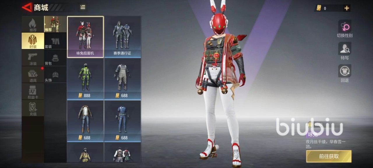 另外可以通过咏兔扭蛋机活动得到咏兔套装,一身非常喜庆的红色加上引人注目的头盔,成为场上最靓的仔。完成赛季通行证任务赠送影武者,利用废土材料拼凑而成废土游荡者,和完成新兵特训活动后赠送先遣特工等,这些无需购买,只要能达到任务要求就会直接赠送。