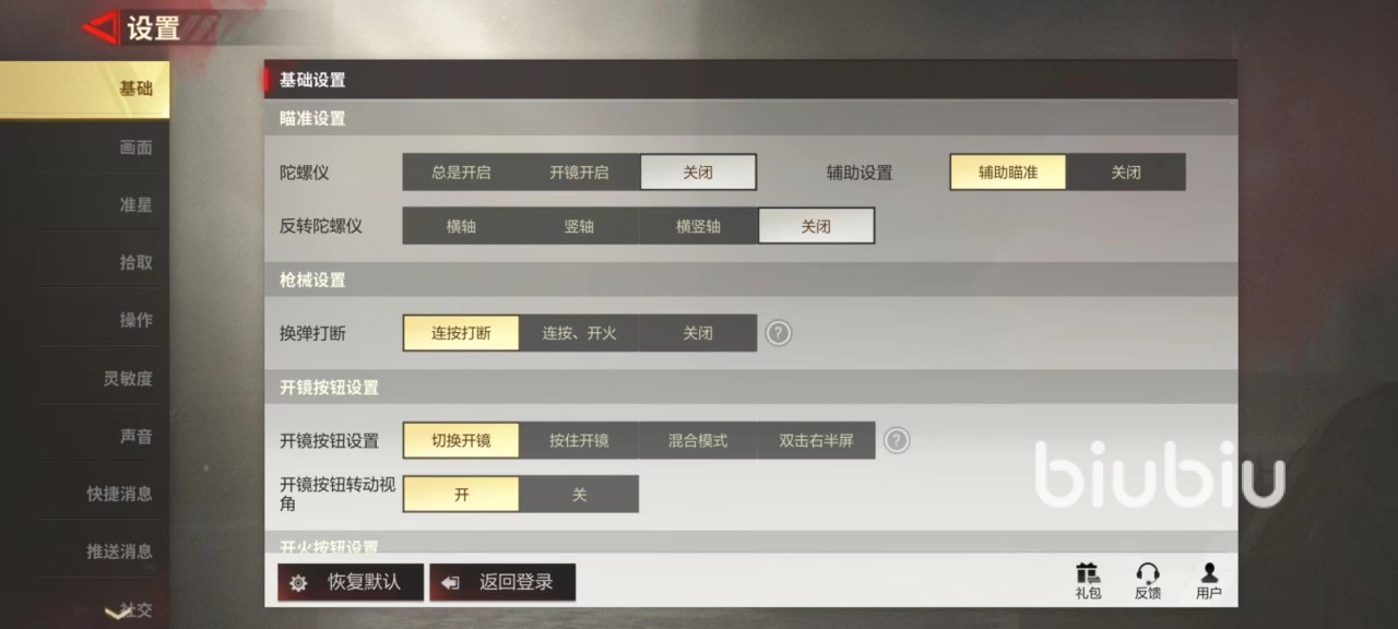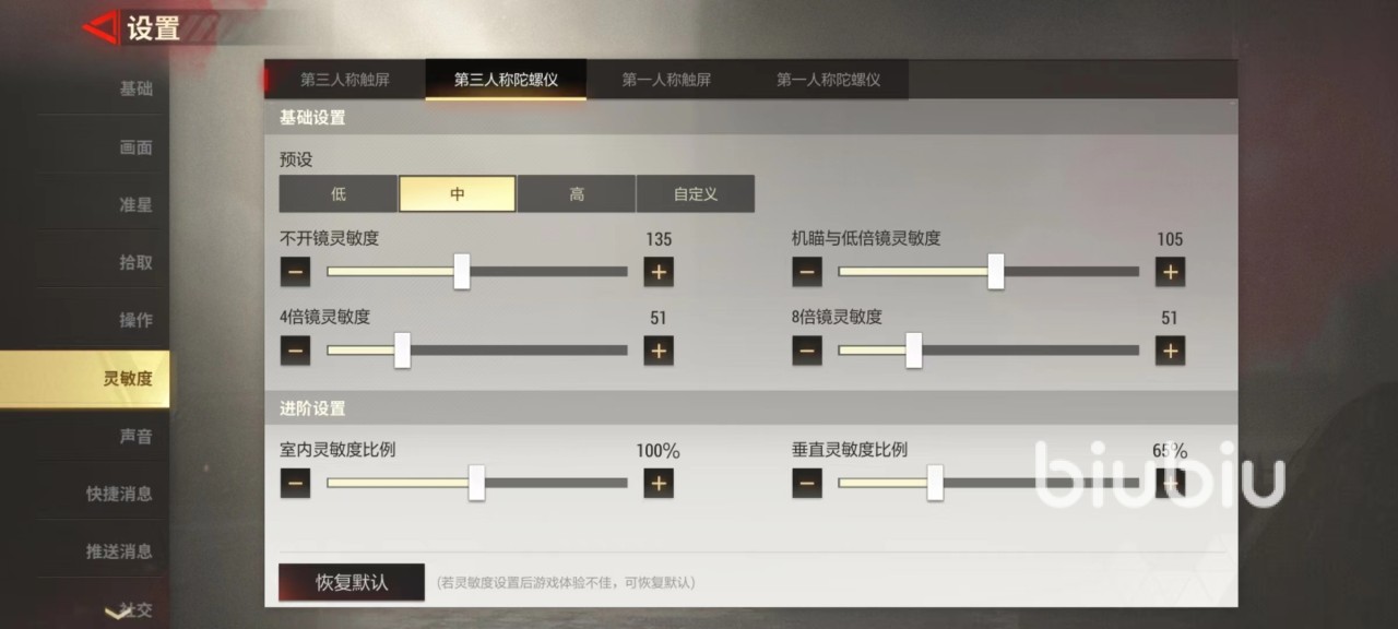 具体灵敏度就是在不同状态下使用陀螺仪也有较大区别,如果习惯于使用机瞄和低倍瞄准镜,例如红点、全息等。就去调整机瞄与低倍镜灵敏度,如果喜欢玩狙击枪,就去调整8倍镜灵敏度等,完全根据自己喜好来设定。和触屏玩法在调整方式上完全相同。调整的时候同样建议在靶场中进行,这样可以随时进行更改,保证达到和自己配合最默契程度。
