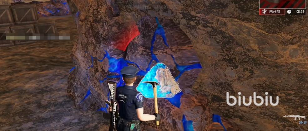 矿洞内蓝色的类似岩石的东西就是所需要开采的矿石,矿石最多都分布在周围的一些过道中,尤其是墙壁上的矿石特别多,也很容易被玩家所忽视,因为前期在不击杀玩家的情况下挖一个矿石需要7-8秒的时间,所以要小心那些想和你争抢矿石的玩家,哪怕是矿镐打在身上一次也是50点的伤害,近距离肉搏枪还真的未必能打过矿镐。