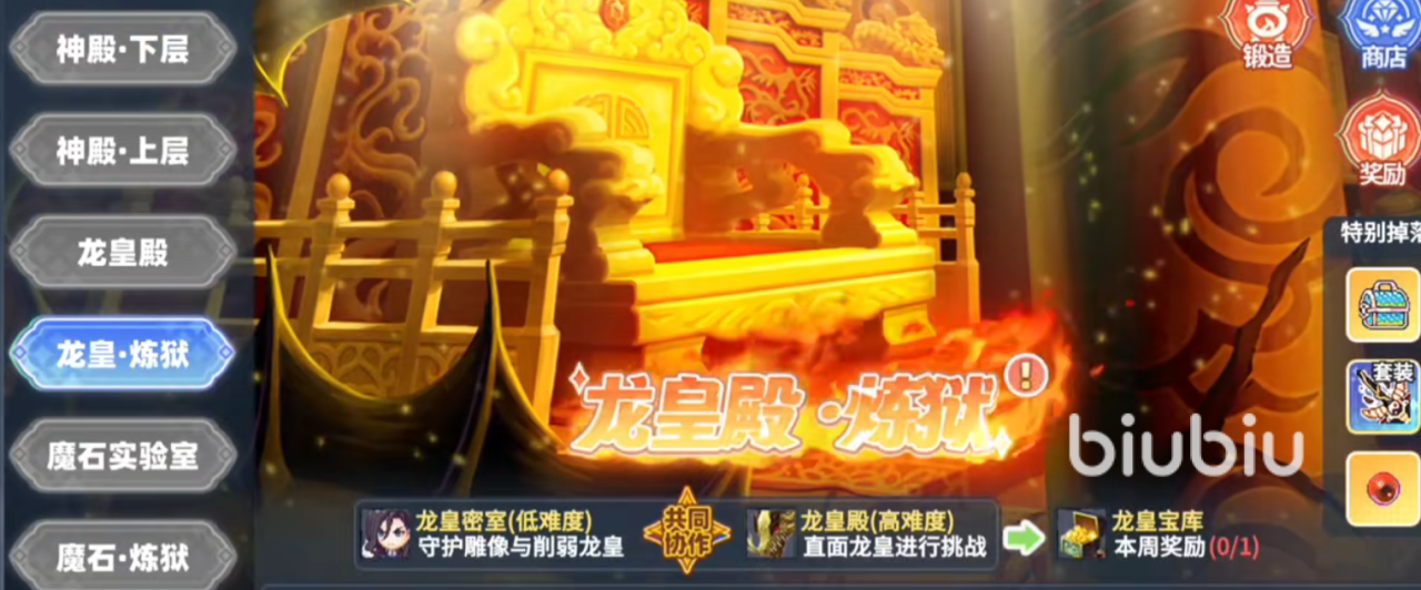 这个副本有特别掉落“宠物·青龙”,还有融合装备,1-4级的融合装是随机出的。这个副本在通关的时候可以有2个选择,一个是直击龙皇本体,另一个是守护女神雕像免遭怪物破坏。进入后有3选1buff,建议选“支配”来加快清怪的速度,下层清得快上层有增伤。