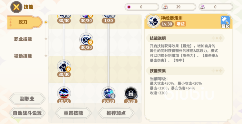 若技能书较多,优先点觉醒和暴走(15-10-3),接着是大风车、凌波斩和狂风刺,按顺序逐个点满即可。技能书充足时,可以实现大风车的无限循环,并且在空档期补充凌波剑气以提升输出效率。