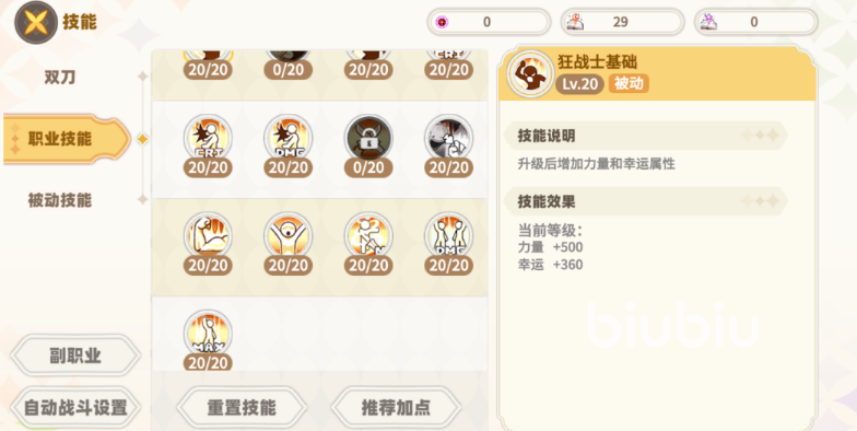 被动技能方面,优先提升大小攻击和背击,然后是暴击暴伤。技能点多时,力量和幸运可以均匀点满;如果技能点较少,先点力量增强和幸运增强,其他的可以暂时不点。