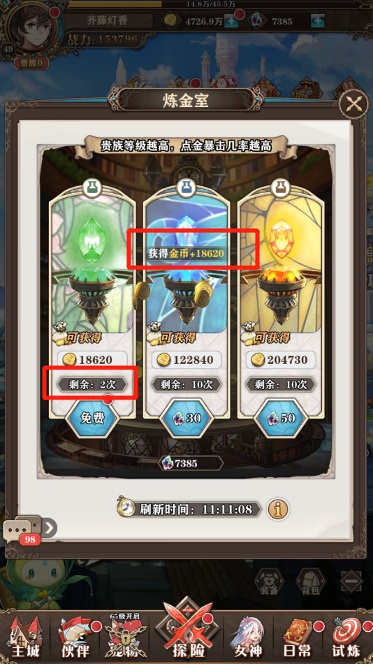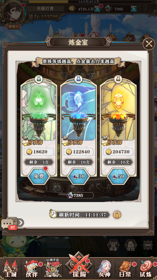 1、炼金师每天有三个刷新时间点,也就是说至少可以白嫖9次的免费机会,等级低也是有几十万金币收入的。
