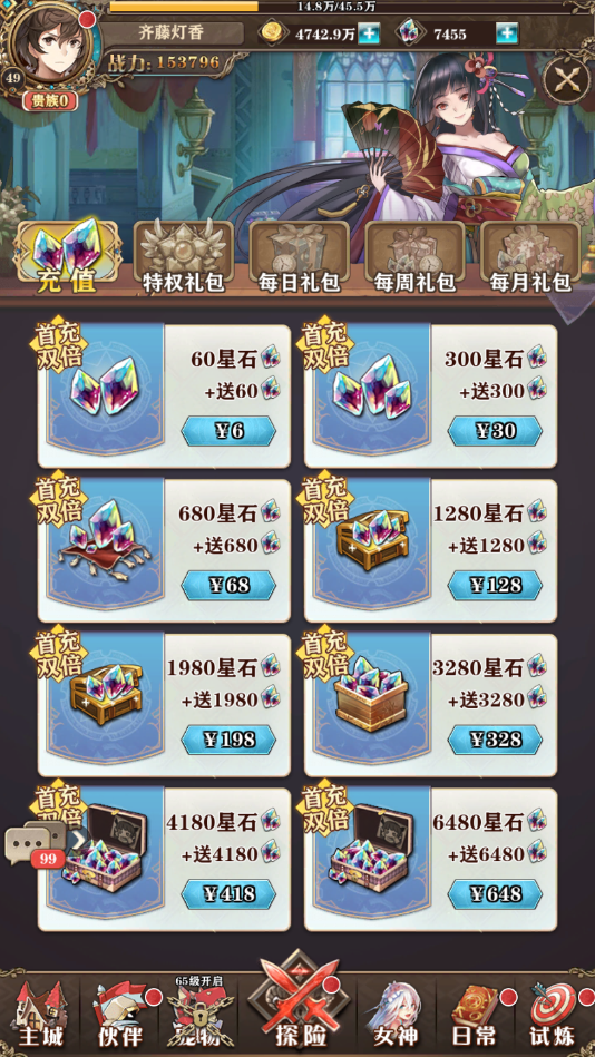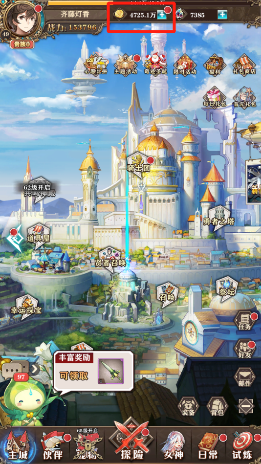1、首先玩家需要进入游戏的主页面,无论是主城、伙伴、宠物、探险、女神、日常、试炼这些哪一个主页面都可以,点击最上方位置金币旁边的的“+”按钮即可打开炼金室。