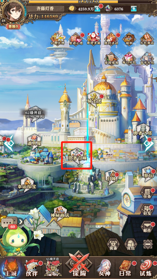(1)如何启动:首先进入到游戏的主页面,点击左下角位置的“主城”进入主城管理界面,然后拖拽屏幕滑动点击“贤者召唤”按钮即可进入该玩法。