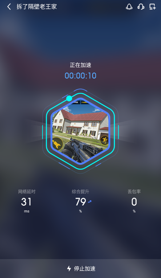 加速界面如下图显示,玩家可以在这里看到综合提升率和网络延迟等实时数据,真正了解加速情况。Biubiu加速器会为玩家智能选择最合适的加速通道,保证您高速畅通的游戏体验。