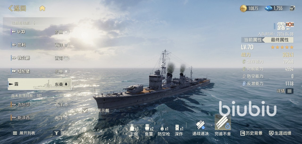 2026年04月13日 15:49 来源:绝代多蚊香蝌蚪今天小编给大家介绍的是苍蓝前线中一艘大家非常熟悉的舰船露,这艘船是属于蓝色品质,是在前期可以直接解锁的舰船之一,将会陪伴度过开荒阶段,所以要搞清楚它的特点,接下来一起看苍蓝前线露怎么样。露是属于东桑阵营,大家通过名称就可以看出,属于驱逐舰类型,并且属于非常独特的雷击驱逐舰。