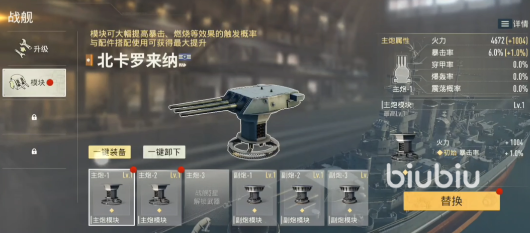 当玩家成功解锁了北卡罗来纳之后,就要开始对战舰进行养成,这个游戏中战舰的养成包括了升级、突破,到了战舰20级、30级、45级之后就会解锁更多的战舰养成内容。在初期阶段,玩家主要的养成方式就是装配各类模块,游戏中的模块内容可是很丰富的。在北卡罗来纳的养成上主要以提升战舰的攻击能力,也就是增加更多的主炮和副炮,每装载一个主炮或者是副炮都会提升战舰的战力。