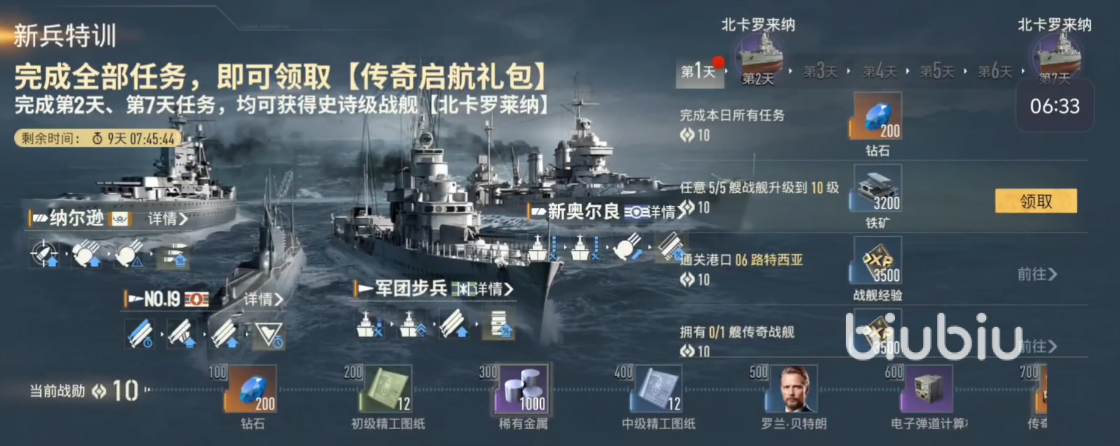 想要组建以北卡罗来纳为主舰的阵容,首先得获得。这艘战舰的获得方式和特别,只需要参与游戏的新兵特训任务就可以领取到,算是游戏开服给大家的福利,只要玩家参与就能获得。玩家错过了游戏开服活动的话,北卡罗来纳也会加入战舰卡池,玩家可以通过抽卡来解锁这个战舰。